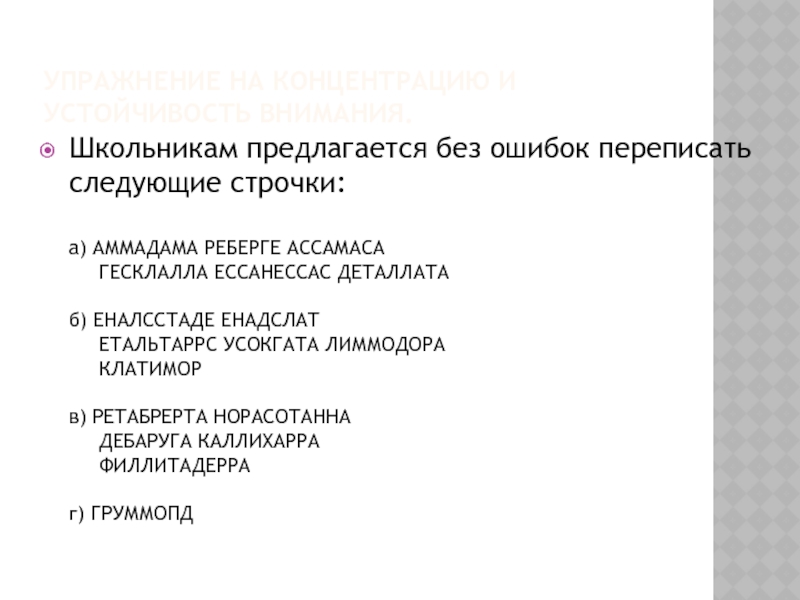 Слайд 21УПРАЖНЕНИЕ НА КОНЦЕНТРАЦИЮ И УСТОЙЧИВОСТЬ ВНИМАНИЯ.