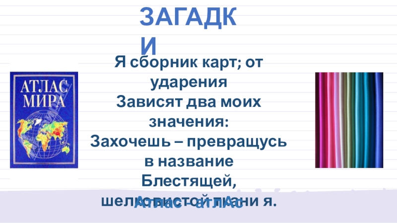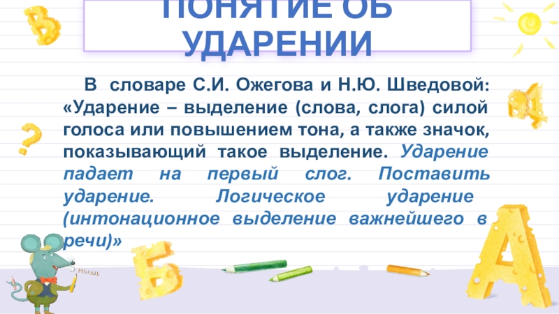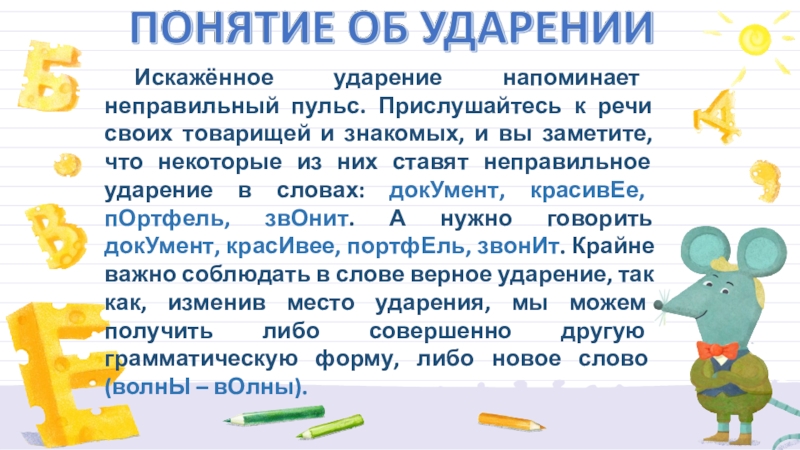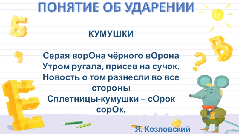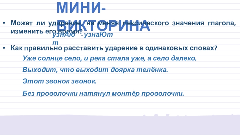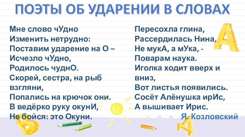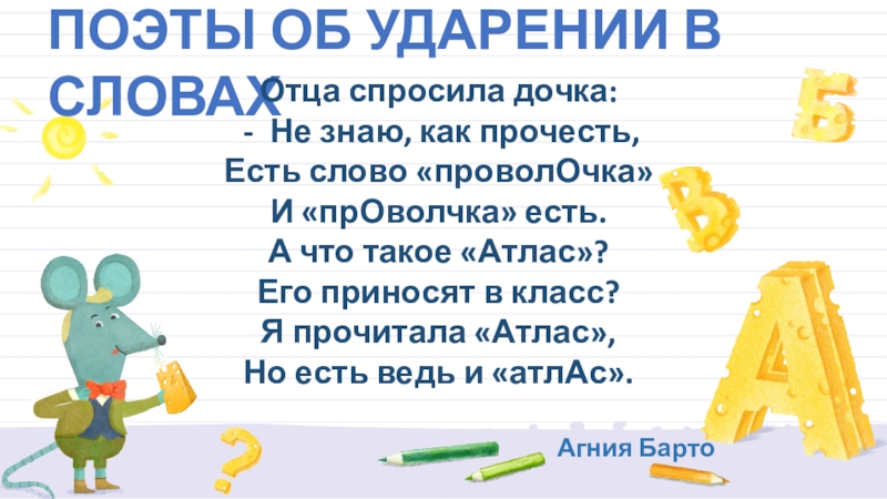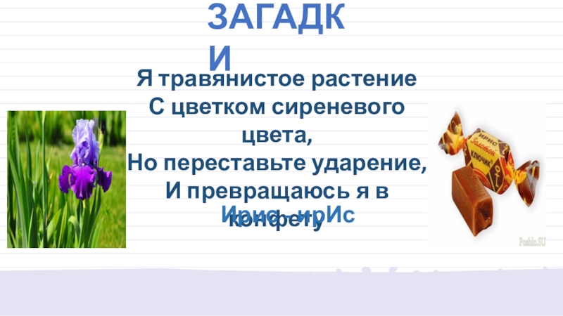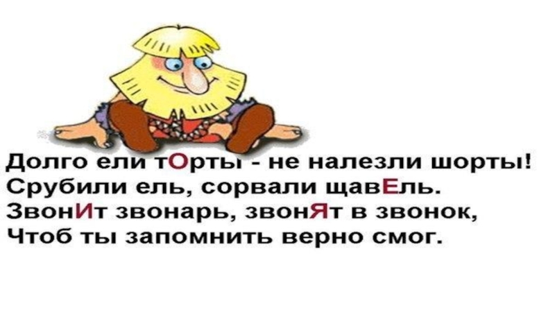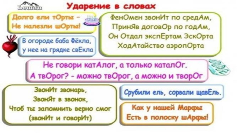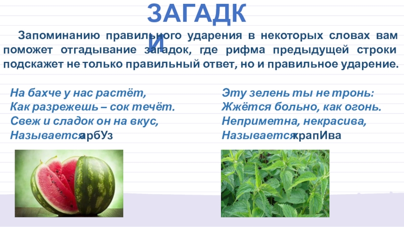 Запоминанию правильного ударения в некоторых словах вам поможет отгадывание загадок, где рифма предыдущей строки подскажет не только правильный ответ, но и правильное ударение.