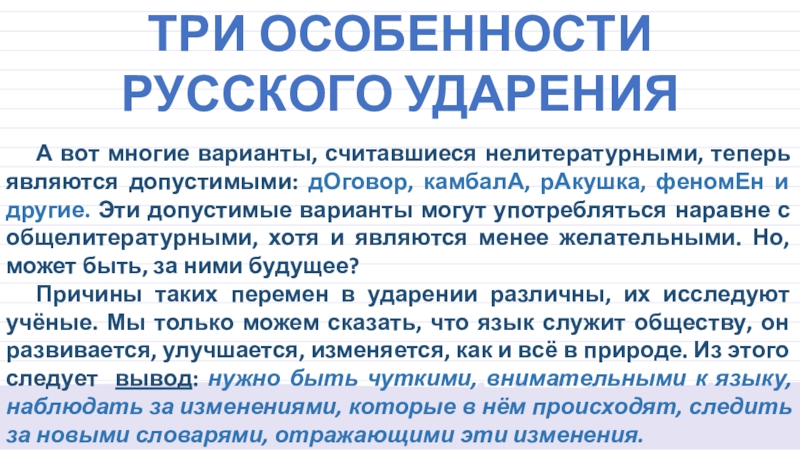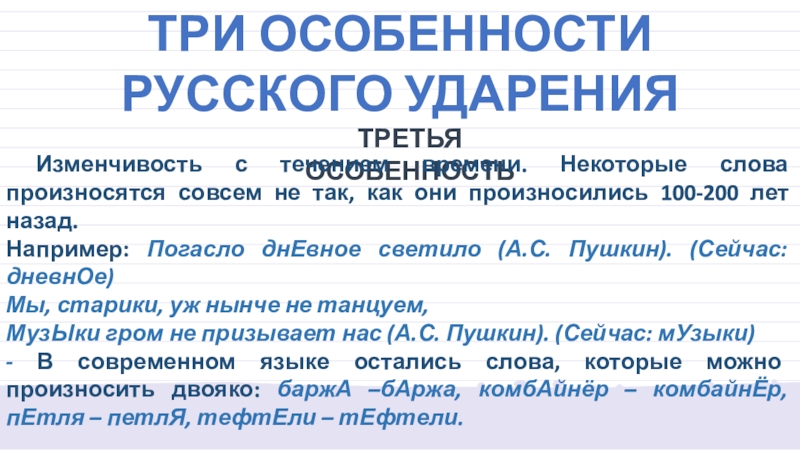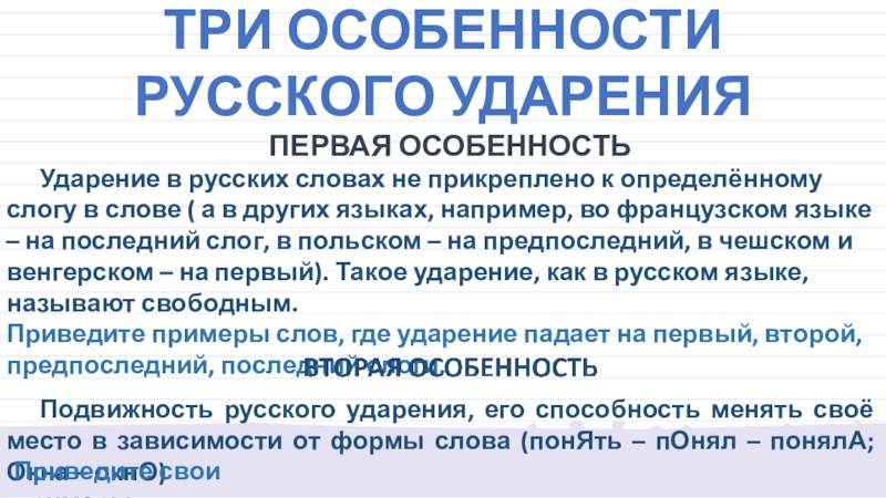 Подвижность русского ударения, его способность менять своё место в зависимости от формы слова (понЯть – пОнял – понялА; Окна – окнО)