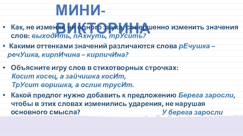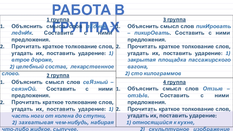 Прочитать краткое толкование слов, угадать их, поставить ударение: