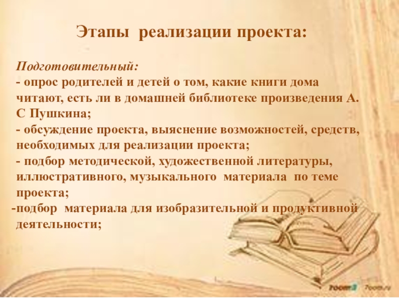 - подбор методической, художественной литературы, иллюстративного, музыкального материала по теме проекта;