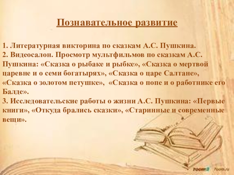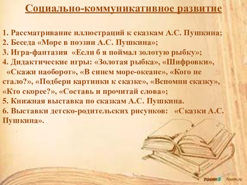13. Приобщать родителей к семейному чтению произведений А.С.Пушкина, к познавательной и творческой деятельности детей.