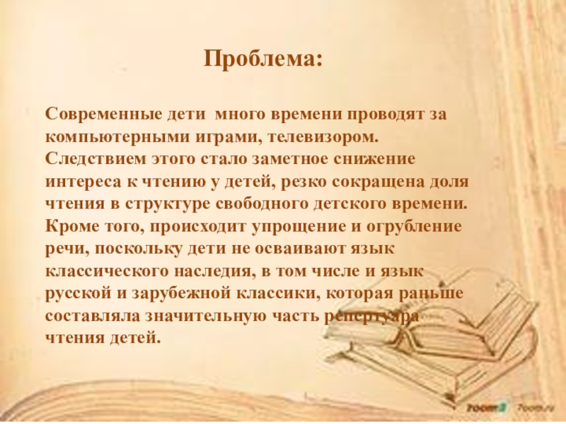 стало заметное снижение интереса к чтению у детей, резко сокращена доля чтения в структуре свободного детского времени. Кроме того, происходит упрощение и огрубление речи, поскольку дети не осваивают язык классического наследия, в том числе и язык русской и зарубежной классики, которая раньше составляла значительную часть репертуара чтения детей.