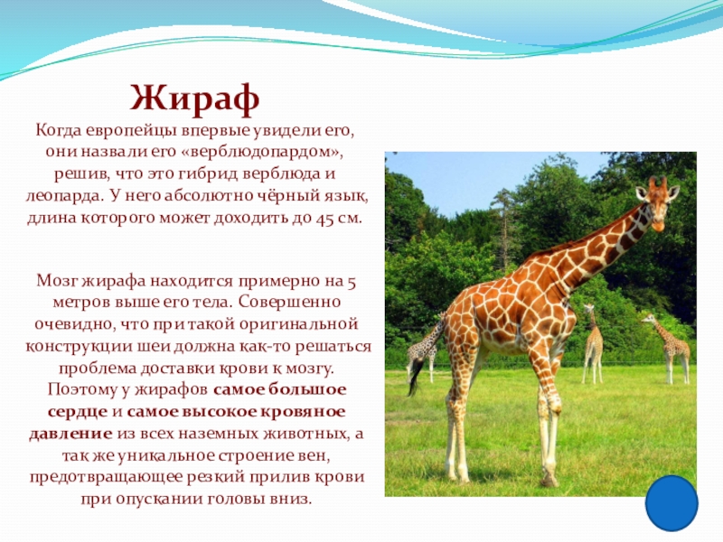 Мозг жирафа находится примерно на 5 метров выше его тела. Совершенно очевидно, что при такой оригинальной конструкции шеи должна как-то решаться проблема доставки крови к мозгу. Поэтому у жирафов самое большое сердце и самое высокое кровяное давление из всех наземных животных, а так же уникальное строение вен, предотвращающее резкий прилив крови при опускании головы вниз.