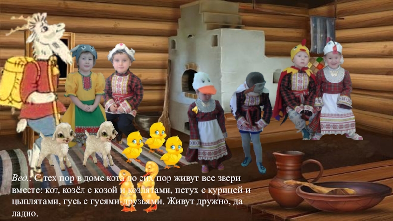 все звери вместе: кот, козёл с козой и козлятами, петух с курицей и цыплятами, гусь с гусями-друзьями. Живут дружно, да ладно.