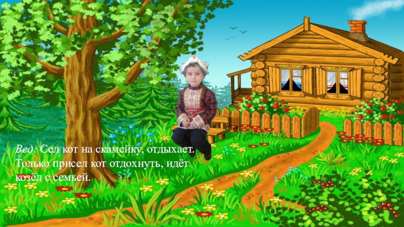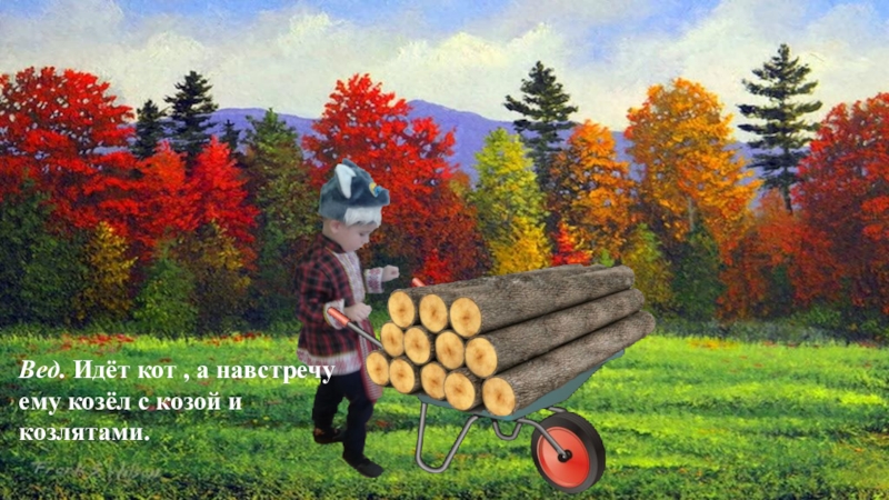 Слайд 13Вед. Идёт кот , а навстречу ему козёл с козой и