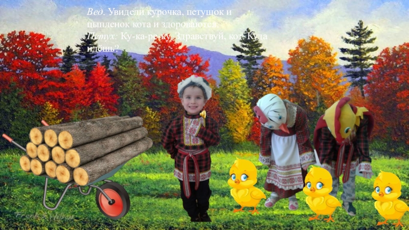 Слайд 17Вед. Увидели курочка, петушок и цыпленок кота и здороваются.