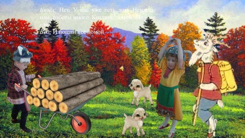 Слайд 15Козёл: Нет. У нас уже есть дом. Некогда нам, работы много.