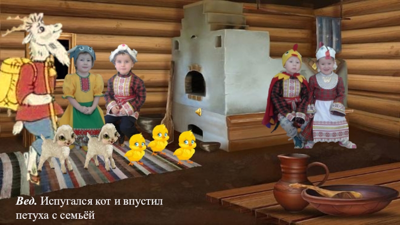 Слайд 30Вед. Испугался кот и впустил петуха с семьёй