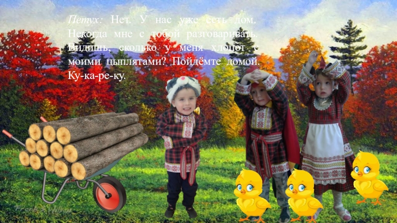 Слайд 19Петух: Нет. У нас уже есть дом. Некогда мне с тобой