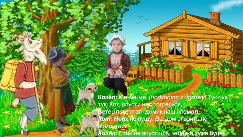 Слайд 27Козёл: Ме-ме-ме. (подходят к домику) Тук-тук-тук. Кот, впусти нас погреться.