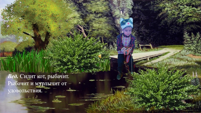 Слайд 4Вед. Сидит кот, рыбачит. Рыбачит и мурлычит от удовольствия.