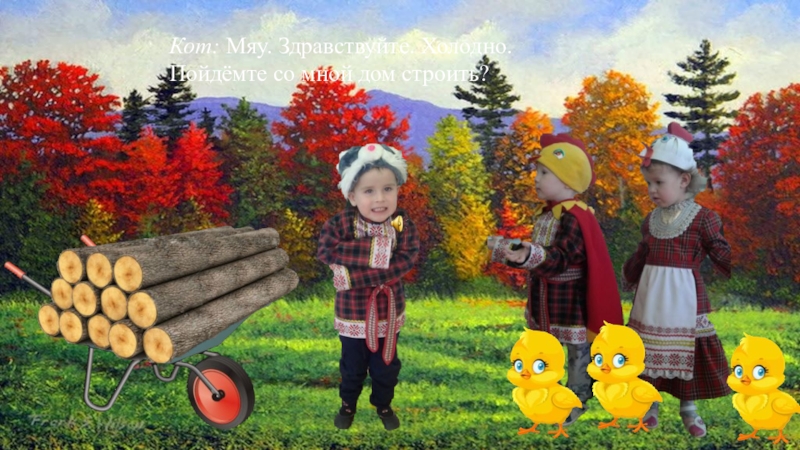 Слайд 18Кот: Мяу. Здравствуйте. Холодно. Пойдёмте со мной дом строить?