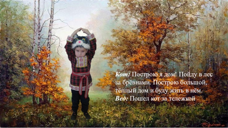 Слайд 11Кот: Построю я дом! Пойду в лес за брёвнами. Построю большой,