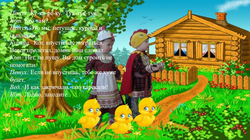 Курица. Кот, впусти нас погреться. Ветер пролетал, домик наш сломал.