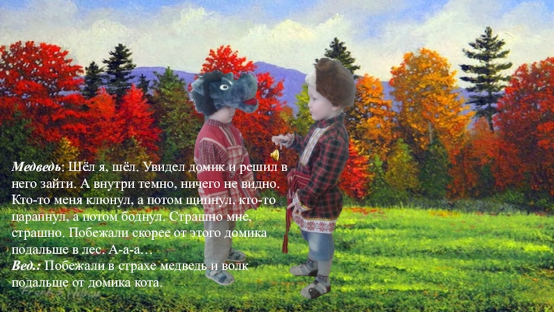 Вед.: Побежали в страхе медведь и волк подальше от домика кота.
