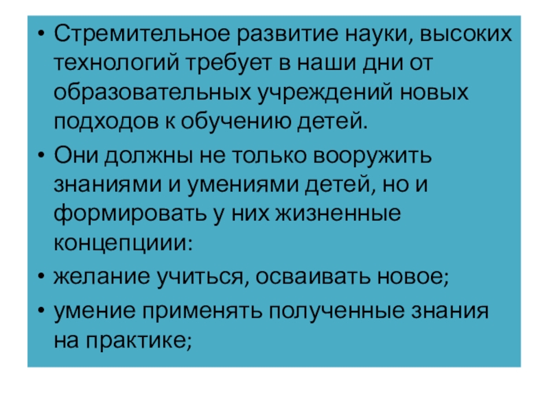 Стремительное развитие науки, высоких технологий требует в наши дни от образовательных учреждений новых подходов к обучению детей.Они должны не только вооружить знаниями и умениями детей, но и формировать у них жизненные концепциии:желание учиться, осваивать новое;умение применять