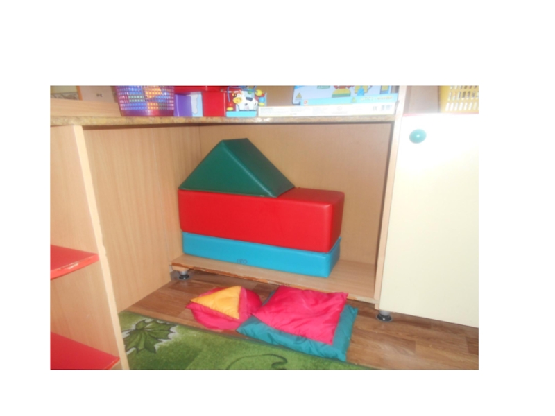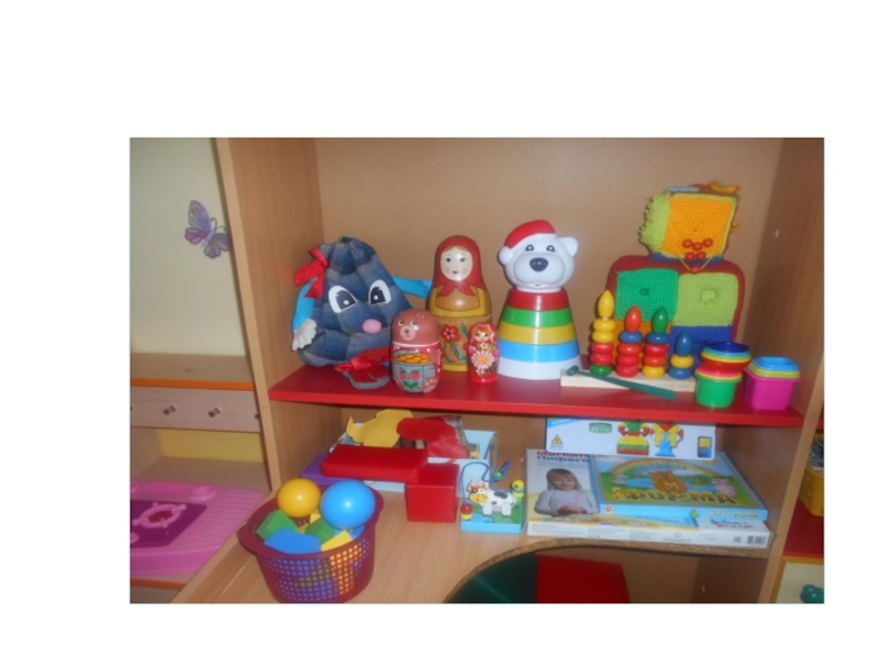 В группах раннего возраста создают сенсомоторные зоны, в которых оборудование знакомит малышей с цветом, формой, величиной предметов,