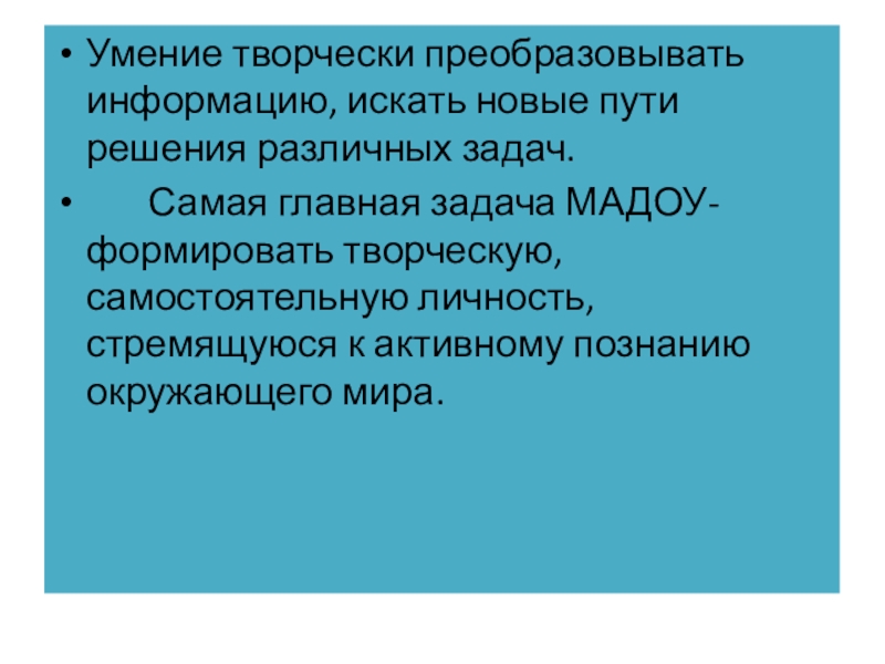 Умение творчески преобразовывать информацию, искать новые пути решения различных задач.    Самая главная задача МАДОУ-