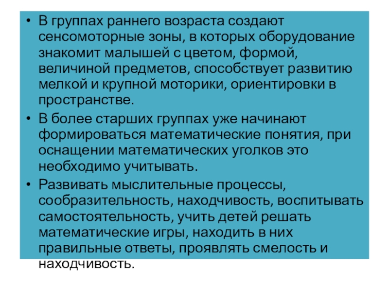 Слайд 4В группах раннего возраста создают сенсомоторные зоны, в которых оборудование знакомит