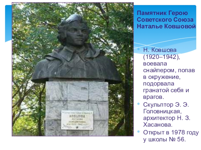 Слайд 26Памятник Герою Советского Союза Наталье Ковшовой