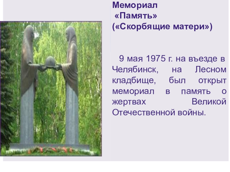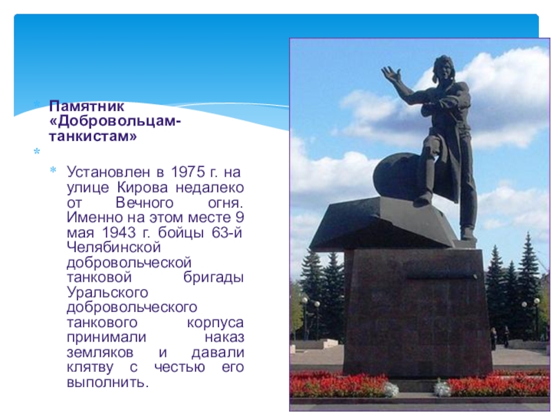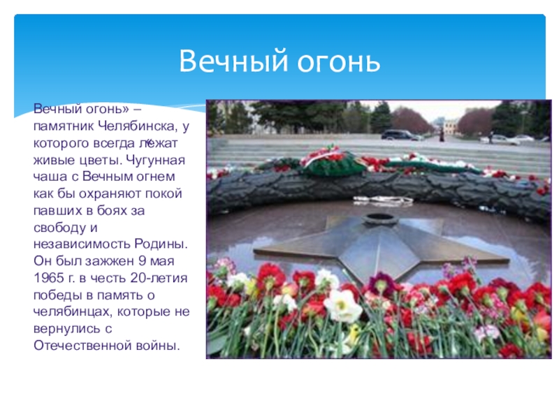 Слайд 11Вечный огонь» – памятник Челябинска, у которого всегда лежат живые цветы.