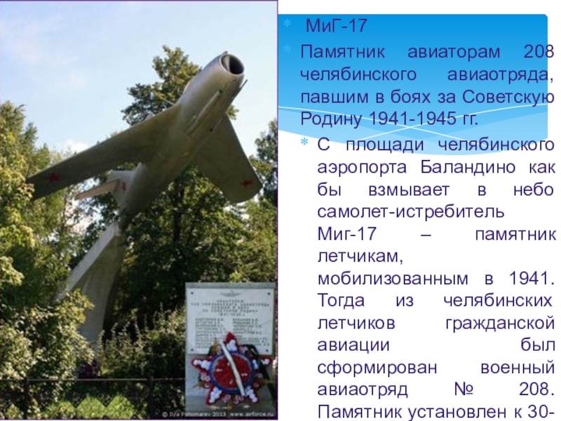 С площади челябинского аэропорта Баландино как бы взмывает в небо самолет-истребитель Миг-17 – памятник летчикам, мобилизованным в 1941. Тогда из челябинских летчиков гражданской авиации был сформирован военный авиаотряд № 208. Памятник установлен к 30-летию Победы в 1975 году.
