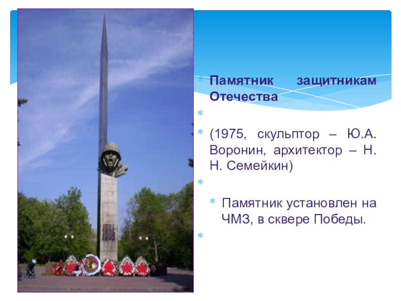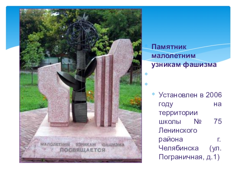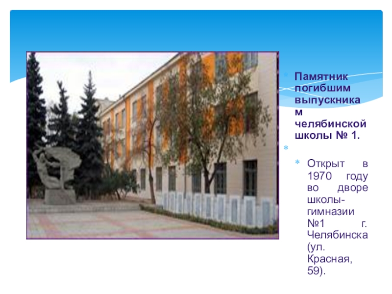 Слайд 22Памятник погибшим выпускникам челябинской школы № 1.