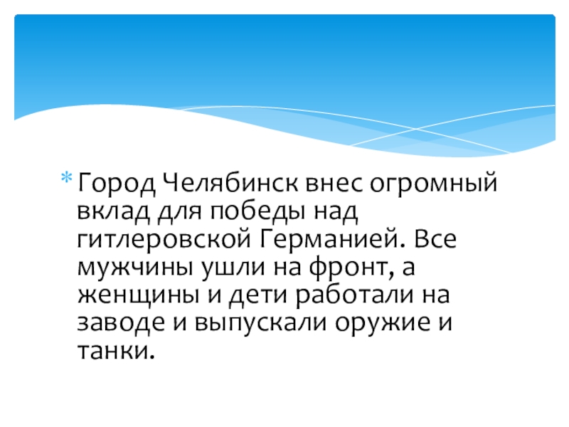 Слайд 6Город Челябинск внес огромный вклад для победы над гитлеровской Германией. Все