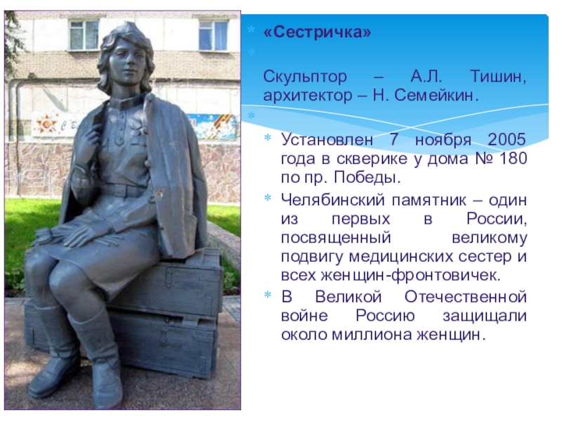Челябинский памятник – один из первых в России, посвященный великому подвигу медицинских сестер и всех женщин-фронтовичек.