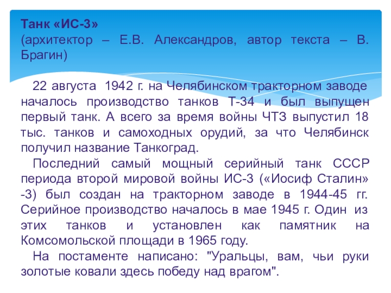 Последний самый мощный серийный танк СССР периода второй мировой войны ИС-3 («Иосиф Сталин»-3) был создан на тракторном заводе в 1944-45 гг. Серийное производство началось в мае 1945 г. Один из этих танков и установлен как памятник на Комсомольской площади в 1965 году.