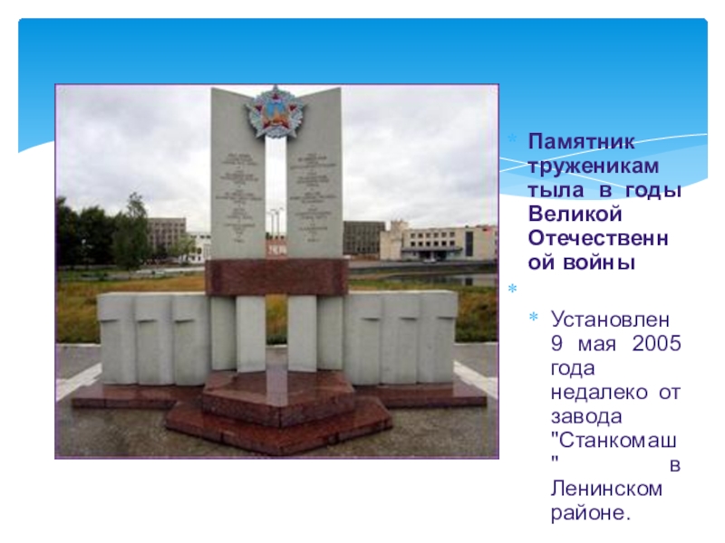 Слайд 21Памятник труженикам тыла в годы Великой Отечественной войны
