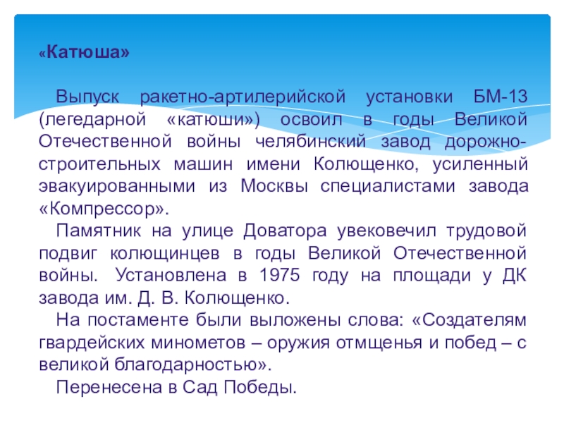 войны челябинский завод дорожно-строительных машин имени Колющенко, усиленный эвакуированными из Москвы специалистами завода «Компрессор».