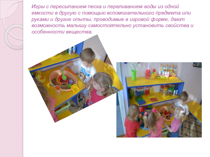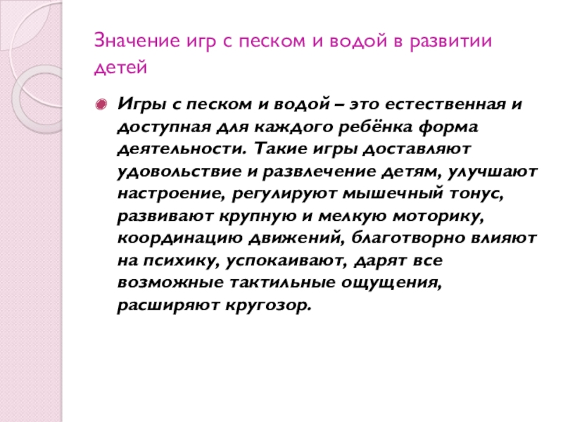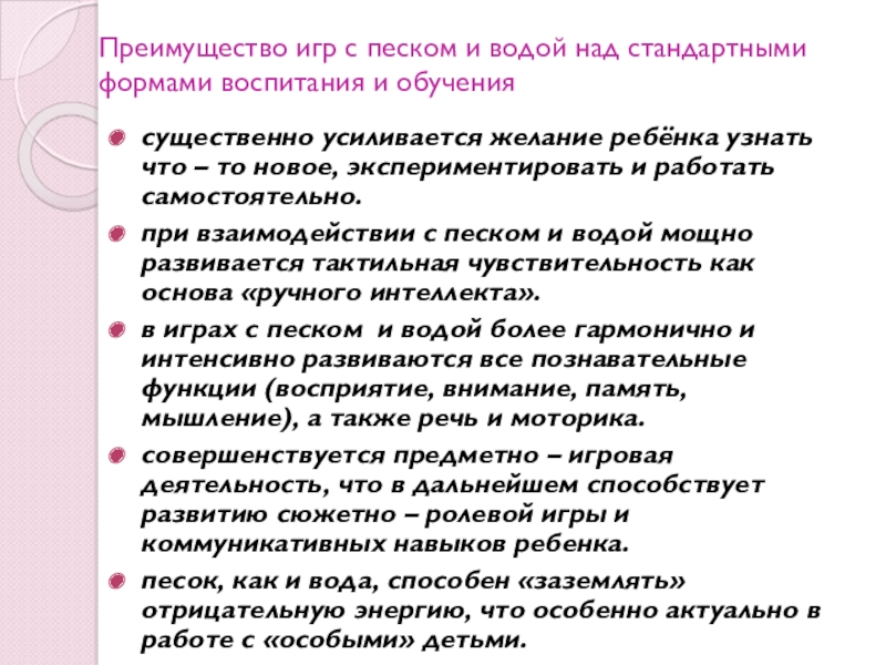 в играх с песком и водой более гармонично и интенсивно развиваются все познавательные функции (восприятие, внимание, память, мышление), а также речь и моторика.