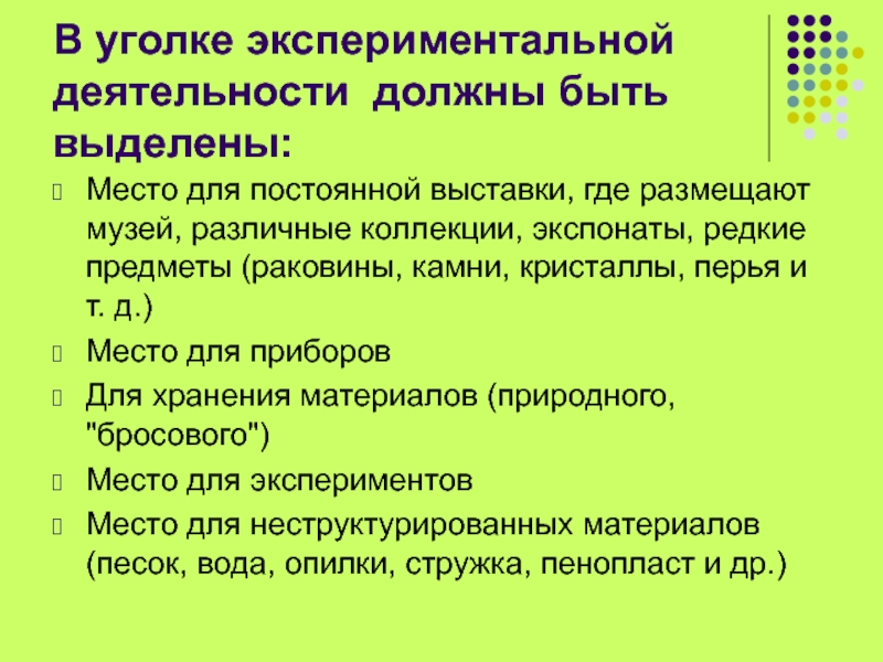 Слайд 4В уголке экспериментальной деятельности должны быть выделены: