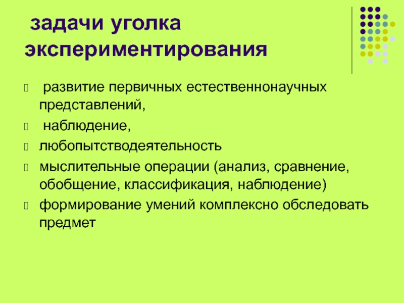 Слайд 2 задачи уголка экспериментирования