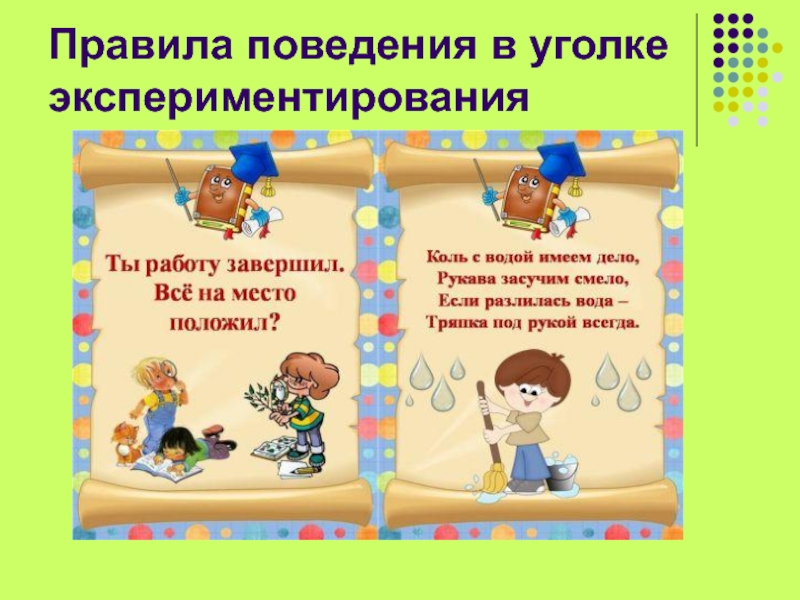 Слайд 10Правила поведения в уголке экспериментирования