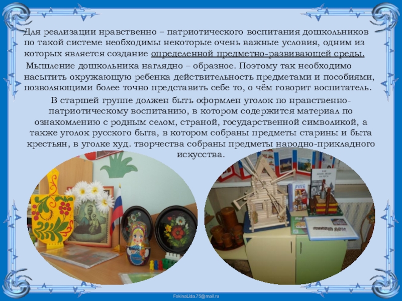 Слайд 5Для реализации нравственно – патриотического воспитания дошкольников по такой системе необходимы