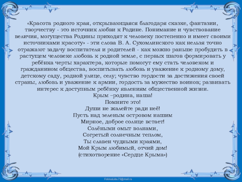 любви к Родине. Понимание и чувствование величия, могущества Родины приходят к человеку постепенно и имеет своими источниками красоту» - эти слова В. А. Сухомлинского как нельзя точно отражают задачу воспитателя и родителей - как можно раньше пробудить в растущем человеке любовь к родной земле, с первых шагов формировать у ребёнка черты характера, которые помогут ему стать человеком и гражданином общества, воспитывать любовь и уважение к родному дому, детскому саду, родной улице, селу; чувство гордости за достижения своей страны, любовь и уважение к армии, гордость за мужество воинов; развивать интерес к доступным ребёнку явлениям общественной жизни.