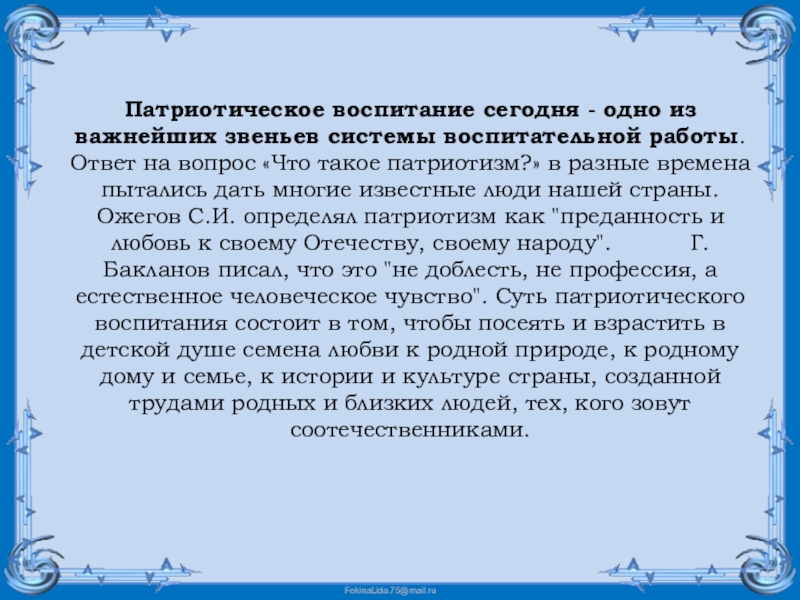 Ответ на вопрос «Что такое патриотизм?» в разные времена пытались дать многие известные люди нашей страны. Ожегов С.И. определял патриотизм как "преданность и любовь к своему Отечеству, своему народу". Г.Бакланов писал, что это "не доблесть, не профессия, а естественное человеческое чувство". Суть патриотического воспитания состоит в том, чтобы посеять и взрастить в детской душе семена любви к родной природе, к родному дому и семье, к истории и культуре страны, созданной трудами родных и близких людей, тех, кого зовут соотечественниками.