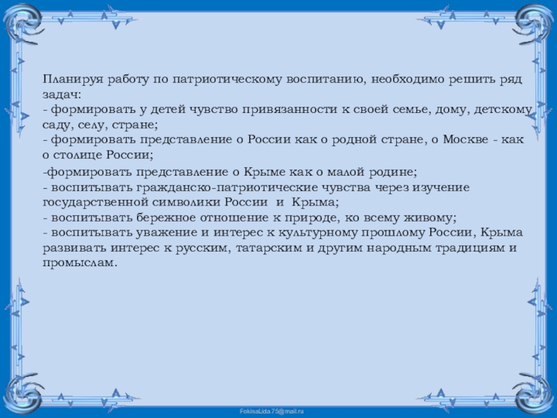 Планируя работу по патриотическому воспитанию, необходимо решить ряд задач: