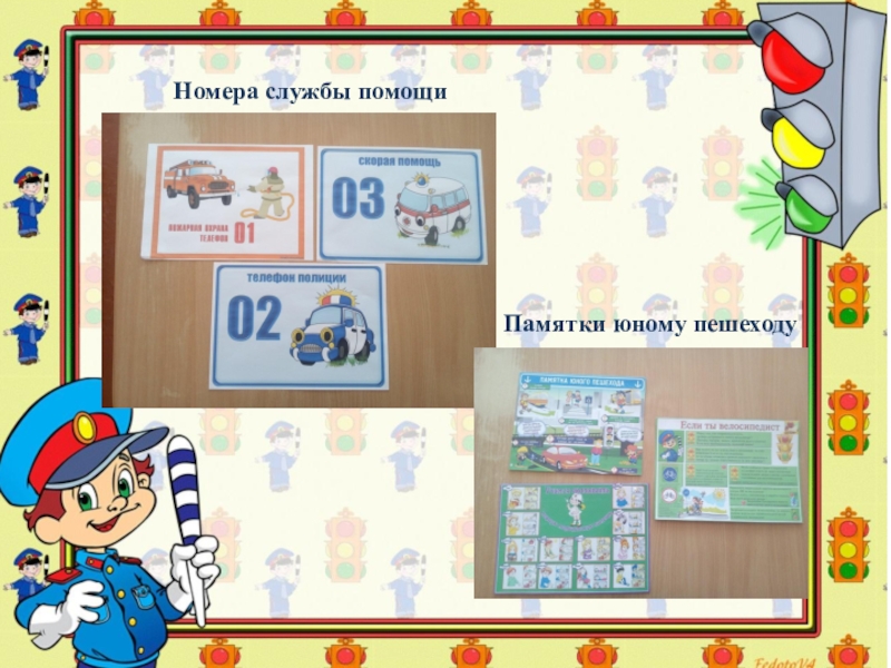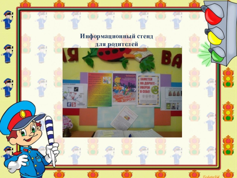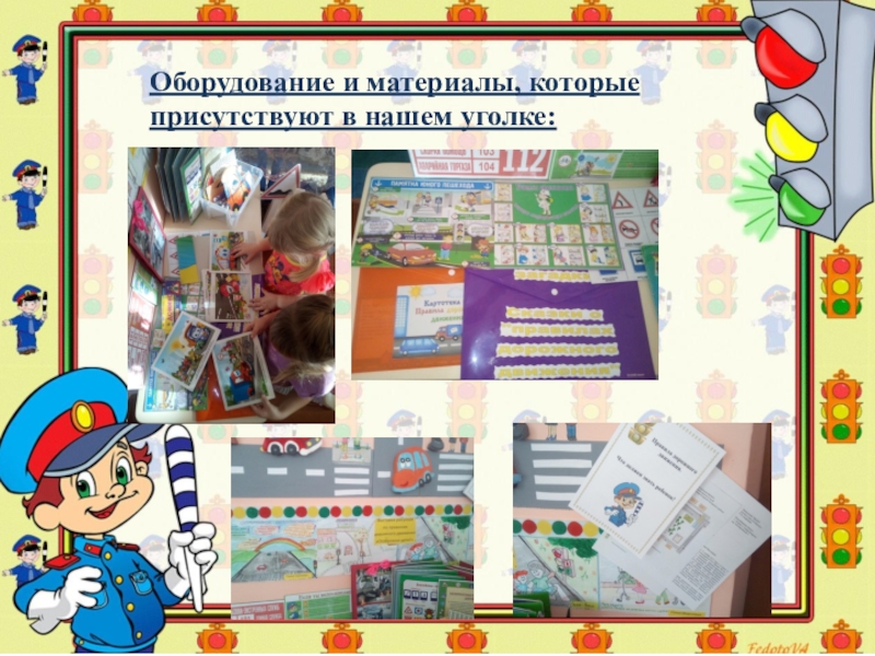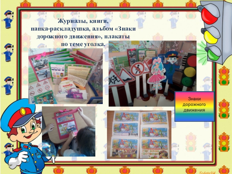 Журналы, книги, папка-раскладушка, альбом «Знаки дорожного движения», плакаты по теме уголка.