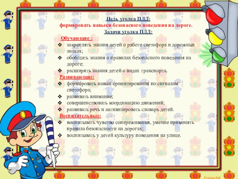 Цель уголка ПДД: формировать навыки безопасного поведения на дороге. Задачи уголка ПДД: Обучающие : закреплять знания детей о работе светофора и дорожных знаках;обобщать знания о правилах безопасного поведения на дороге;расширять знания детей о видах транспорта. Развивающие: