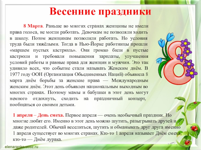 1 апреля – День смеха. Первое апреля — очень необычный праздник. Но многие любят его. Именно в этот день можно шутить, разыгрывать друзей и даже родителей. Обычай веселиться, шутить и обманывать друг друга именно 1 апреля существует во многих странах. Кто-то 1 апреля называет Днём смеха, кто-то — Днём дурака.