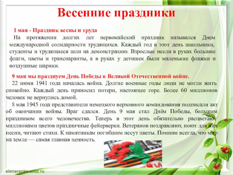 8 мая 1945 года представители немецкого верховного командования подписали акт об окончании войны. Враг сдался. День 9 мая стал Днём Победы, большим праздником всего человечества. Теперь в этот день обязательно расцветают миллионами цветов праздничные фейерверки. Ветеранов поздравляют, поют для них песни, читают стихи. К памятникам погибшим несут цветы. Помним всегда, что мир на земле — самая главная ценность.