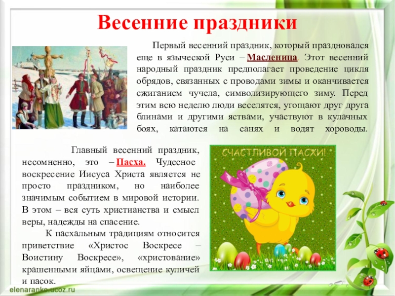 Главный весенний праздник, несомненно, это – Пасха. Чудесное воскресение Иисуса Христа является не просто праздником, но наиболее значимым событием в мировой истории. В этом – вся суть христианства и смысл веры, надежды на спасение.
