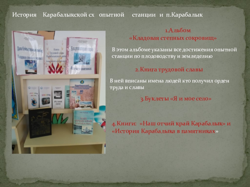 4.Книги: «Наш отчий край Карабалык» и «История Карабалыка в памятниках»
