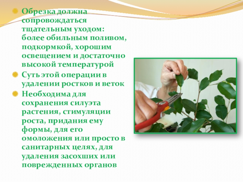 Слайд 16Обрезка должна сопровождаться тщательным уходом: более обильным поливом, подкормкой, хорошим освещением