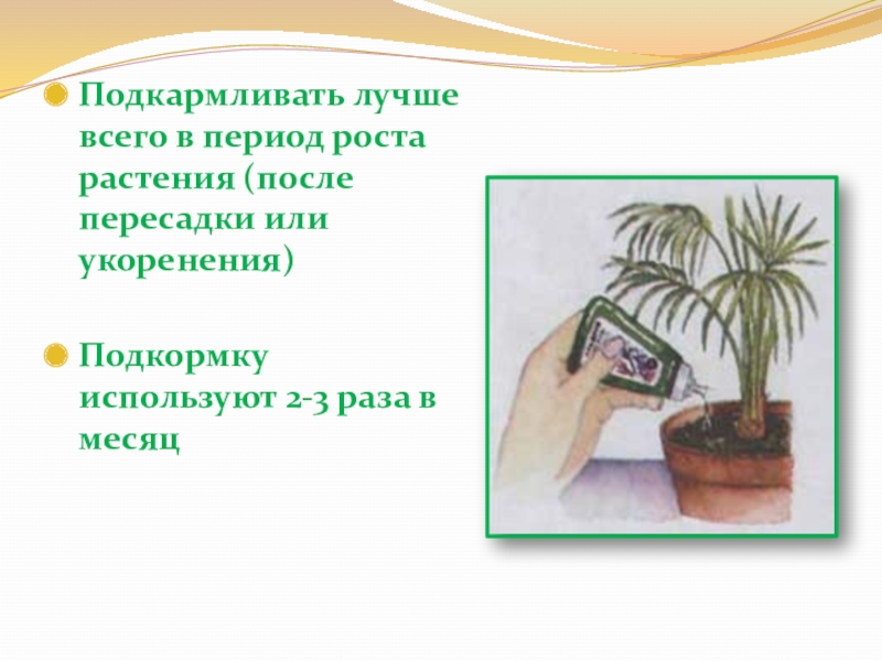 Слайд 14Подкармливать лучше всего в период роста растения (после пересадки или укоренения)