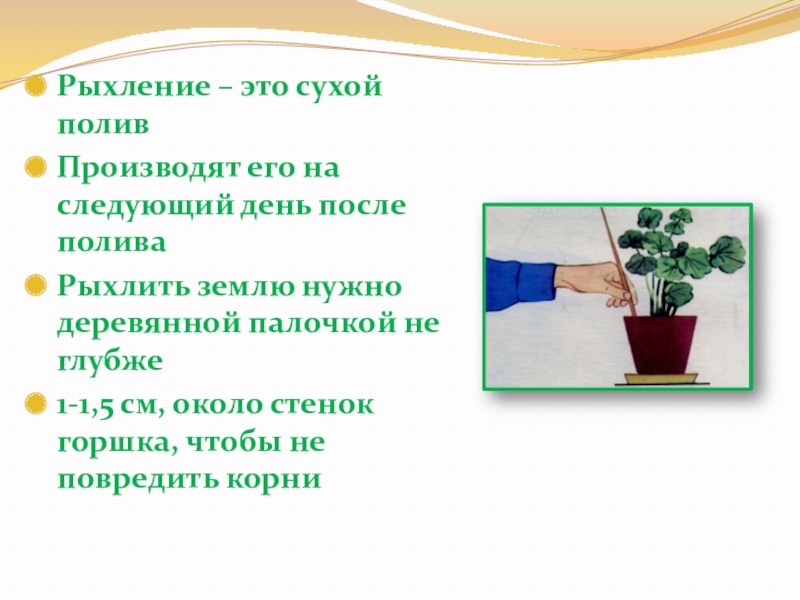 Рыхление – это сухой поливПроизводят его на следующий день после поливаРыхлить землю нужно деревянной палочкой не глубже